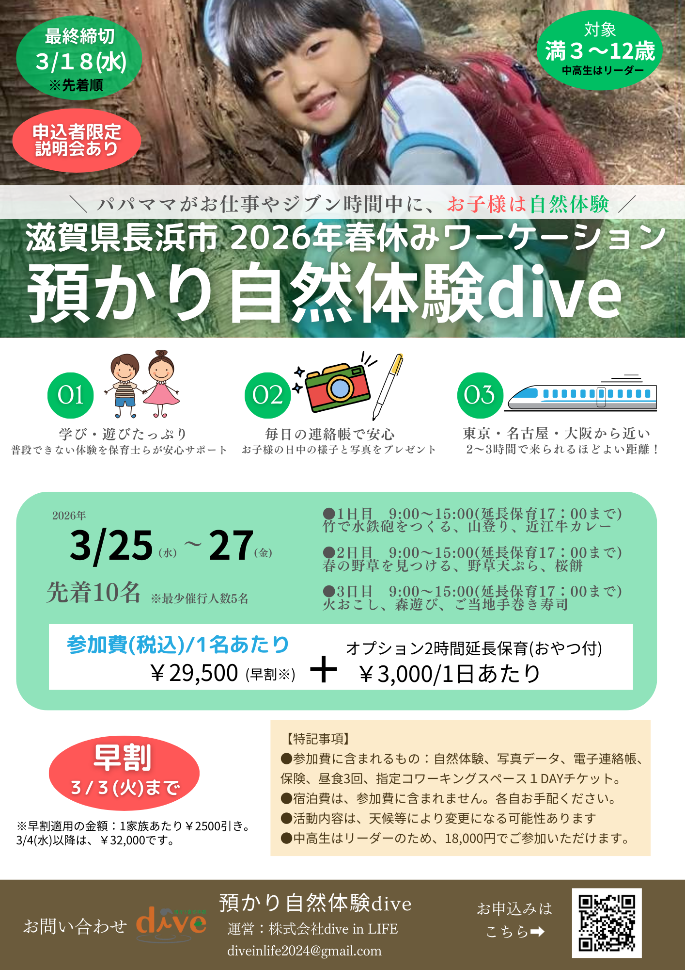 ●参加費に含まれるもの:自然体験、写真データ、電子連絡帳、保険、昼食3回、指定コワーキングスペース1DAYチケット。